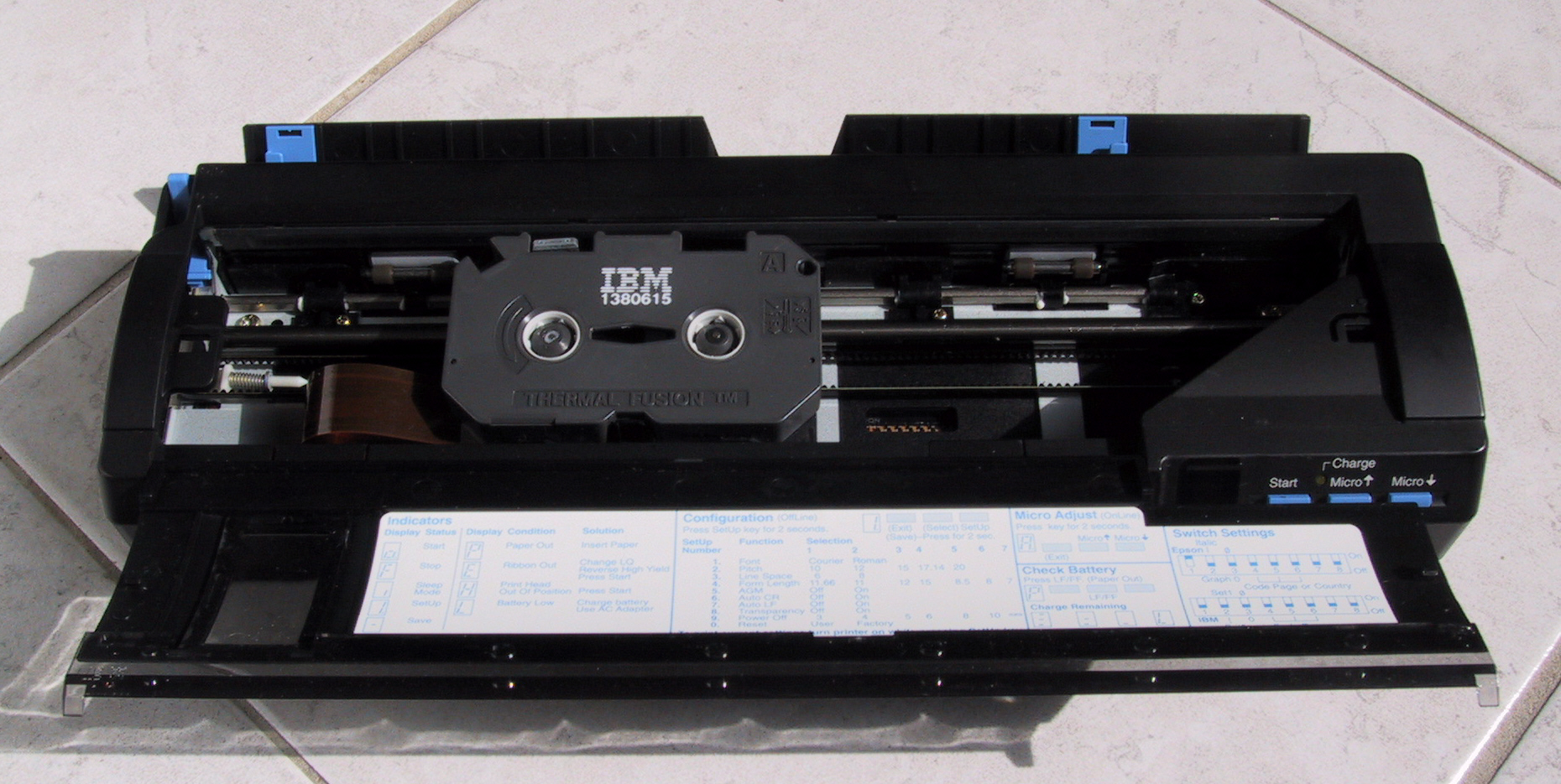 Der IBM 5183 Drucker ist einer der kleinsten Laptop Drucker auf dem Markt. Er arbeitet nach dem Thermotransfer Verfahren und kann sowohl auf Thermopapier als auch, mit einem Farbband, auf Normalpapier drucken. Die Stromversorgung erfolgt über einen eingebauten Accu, damit ist der Drucker Netzunabhängig.