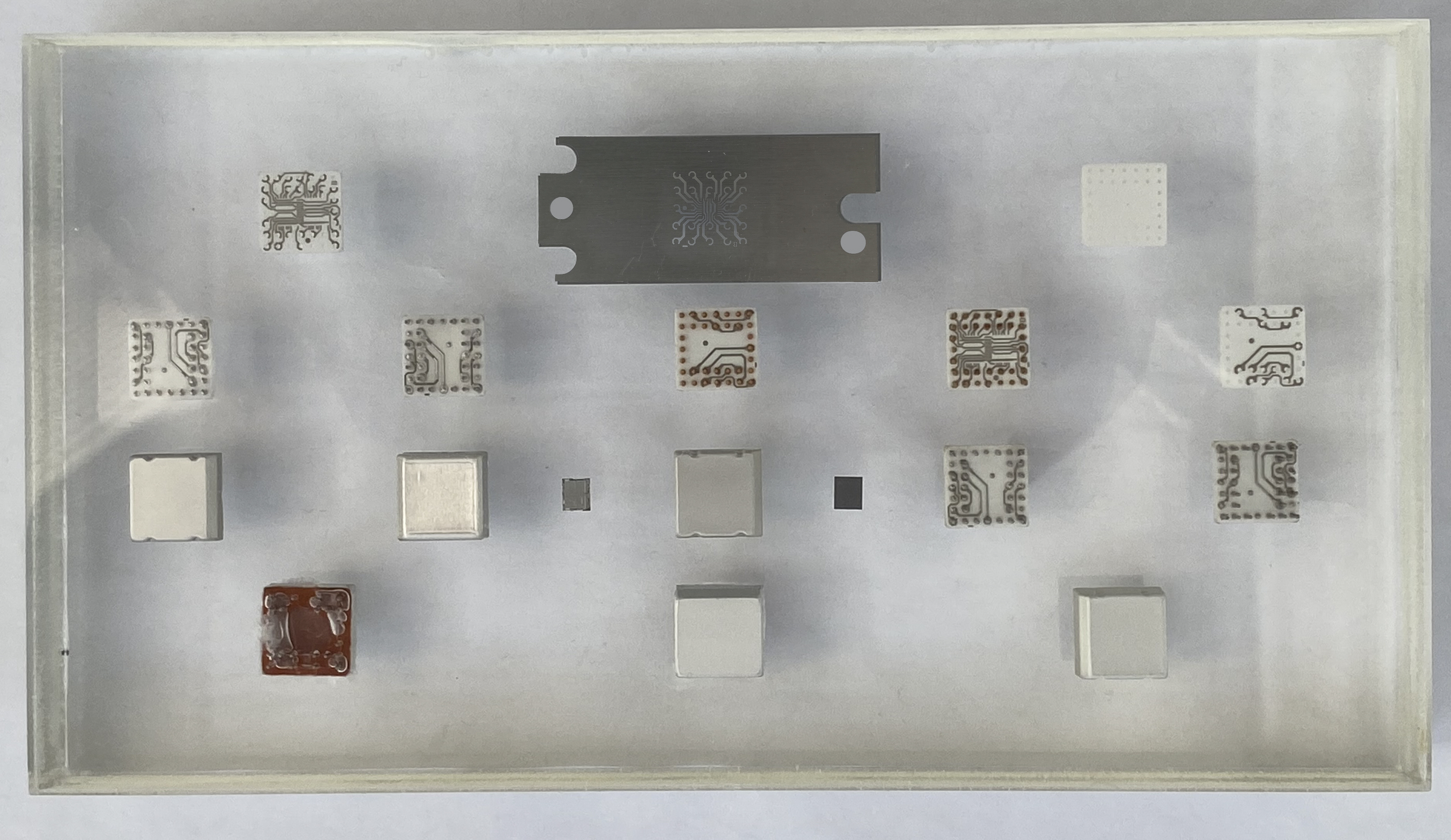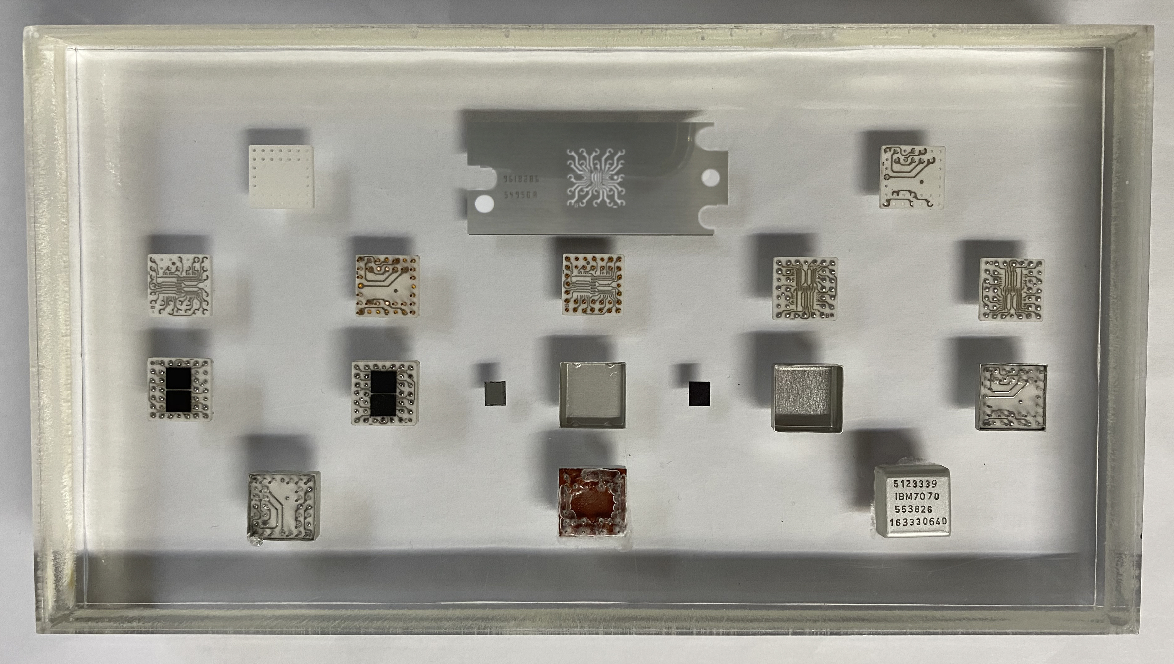 Die IBM SLT Technologie (Solid Logic Technology) war der erste Schritt hin zu integrierten Schaltungen in Computern . Der Demoblock oben zeigt die Schritte bei der Herstellung eines Speicher Modules in SLT Technik. Oben von links nach rechts: ein gebohrter Keramik Block, die Siebdruckmaske für die Leiterbahnen, ein bedruckter Block, nächste Zeile: die bedruckte Rückseite, vergolden, Einsetzen der Kontaktdrähte, Aufbringen von Widerständen und Kondensatoren, Löten, nächste Reihe: Anbringen der IC Module, zwei IC Chips, die Metallkappe außen und innen, das Modul von der Kontaktseite, nächste Zeile: Kappe aufgesetzt, Isolation der Unterseite und das fertige bedruckte Modul Der Demoblock unten zeigt die Rückseite. Diese IC Module wurden als Bauteile in SLT Karten verdrahtet