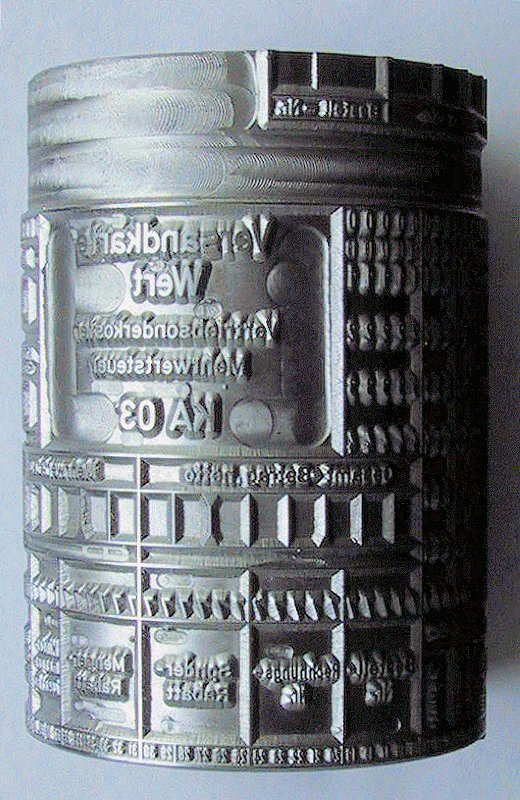 Dies ist eine Druckwalze zum Drucken von klassischen IBM Lochkarten mit 12 Zeilen und 80 Spalten. Die festen Papiere wurden mit hoher Geschwindigkeit unter der Druckwalze hindurch befördert und dabei mit den individuellen Kundeneinteilungen bedruckt. Oftmals wurden diese Karten anschließend auch mit einer Kartenart vorgestanzt, um Locher Zeit zu sparen, hier die KA 03