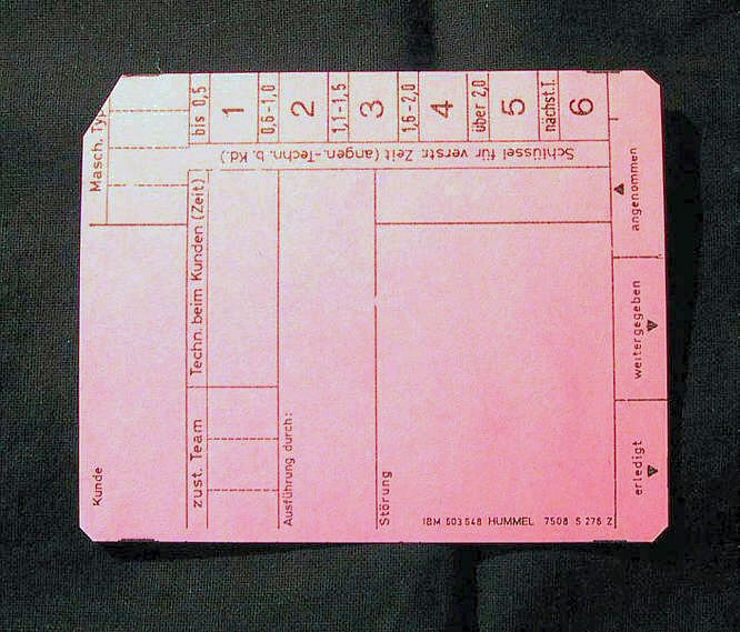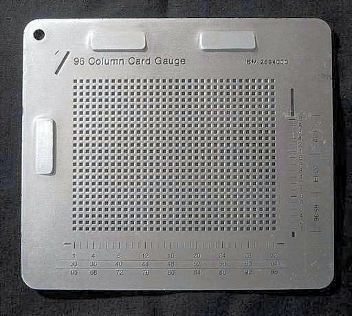 Dies ist eine neue IBM Lochkarte mit 24 Zeilen und 96 Spalten, wie sie bei der Ankündigung des Systems IBM/3 vorgestellt wurde. Im Gegensatz zur 80 spaltigen Lochkarte waren hier die Löcher rund Da die Lochkarten auf Lochern erstellt wurden, die 24 Stempel untereinander ansteuern konnten, wurde über eine Friktionskupplung der waagerechte Transport in 96 Schritten vorgenommen. Es konnte also leicht vorkommen, daß die Anordnung der Spalten sich verschob.
