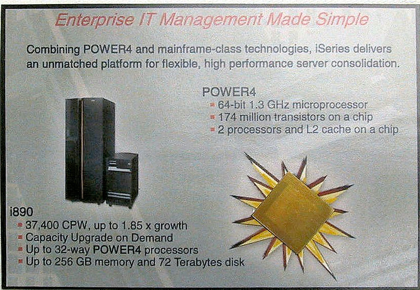 Dies ist die Ankündigungskarte des IBM Power 4 Chips zur CEBIT 2002. Die technischen Daten sind auf der Karte zu entnehmen. Dieser Chip wird zukünftig in den Prozessoren der i-Series und der p-Series verwendet.