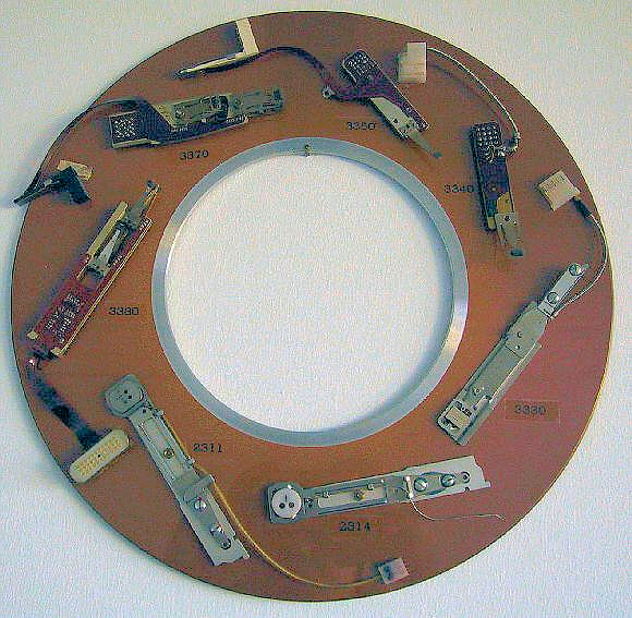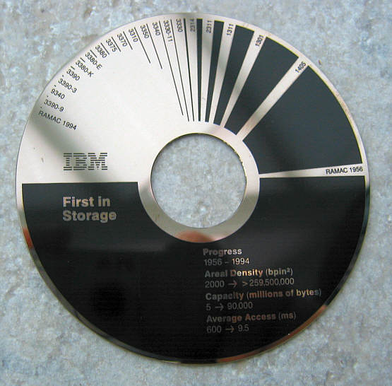 Hier wird die Entwicklung der DASD (Direct Access Storage Device) oder Festplatten Technik gezeigt. Diese Plattenscheibe stammt aus der Dünnfilmtechnik und zeigt die Entwicklung der Platten Speichertechnologie zwischen 1956 und 1994: