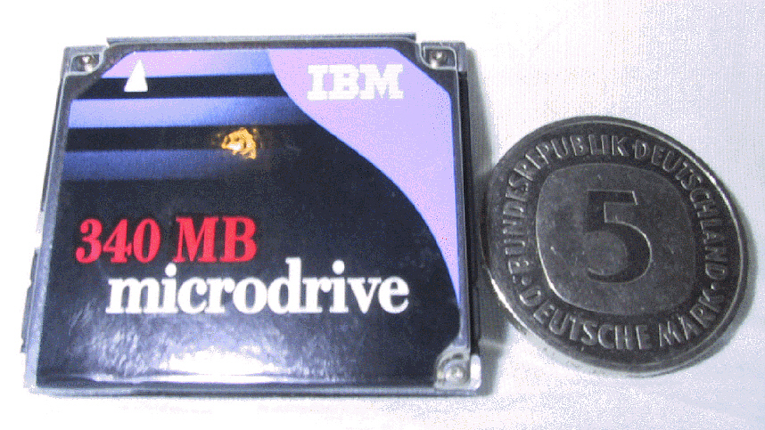 Microdrive Festplatte von IBM mit 340 MB Speicherkapazität, CF Typ I, die erste Microdrive auf dem Weltmarkt.