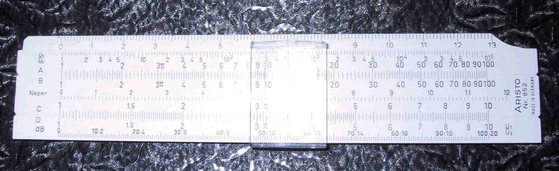 Der Aristo Rechenschieber Modell 852 ist ein handlicher Rechenstab für Akustik-Ingenieure, den man gut in der Hemdtasche tragen konnte und ihn deshalb immer dabei hatte. Auf dem festen Teil sind die Skalen U1/U2, A, D, dB, auf der Zunge die Skalen B,Neper,C, und auf der Zungen-Rückseite ist eine Umrechnungs-Skala für Volt/dB