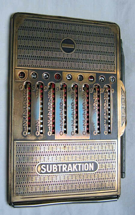 Der Duplex "Addiator" ist ein mechanischer Schieberechner, der durch Einstellen der Werte über die Schieber die Grundrechenarten Addition und Subtraktion durchführen konnte. Addition wurde auf der Vorderseite, Subtraktion auf der Rückseite durchgeführt Multiplikation und Division wurden durch mehrfache Addition oder Subtraktion erstellt .