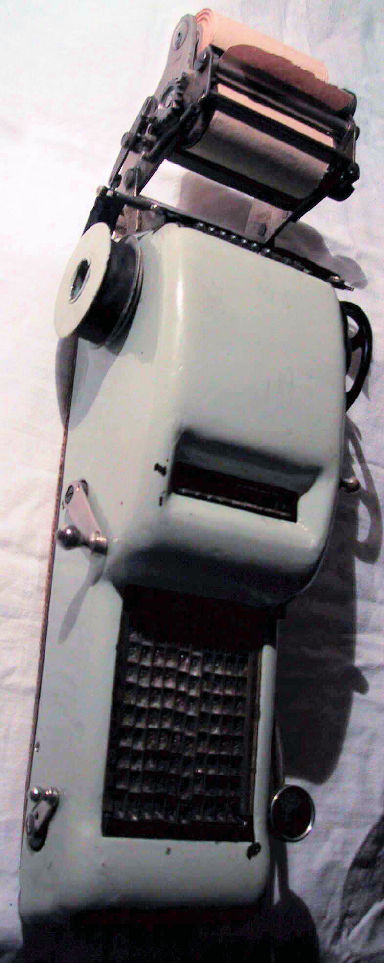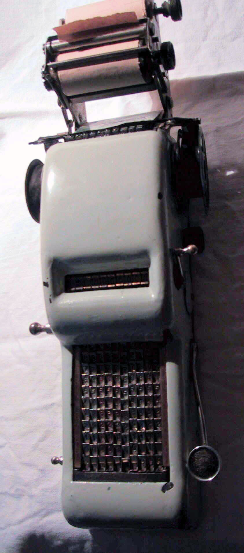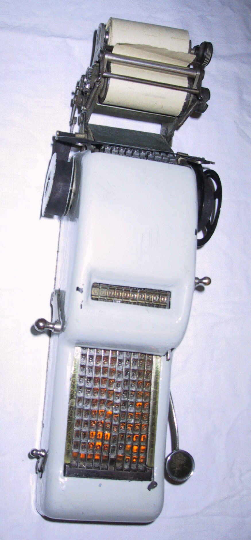 10 stelliges Rechenwerk, gerechnet wird mit Hilfe eines Stabes, durch den auf den Schiebern die gewünschte Zahl eingestellt wird. Hierdurch wird diese Zahl automatisch zu dem Ergebnis im oberen Feld addiert. Jede Eingabe kann durch Druck auf den rechten Hebel auf dem Kontrollstreifen angedruckt werden. Der linke vordere Hebel stellt die Eingabeschienen zurück Der Hebel links hinten stellt das Rechenwerk zurück