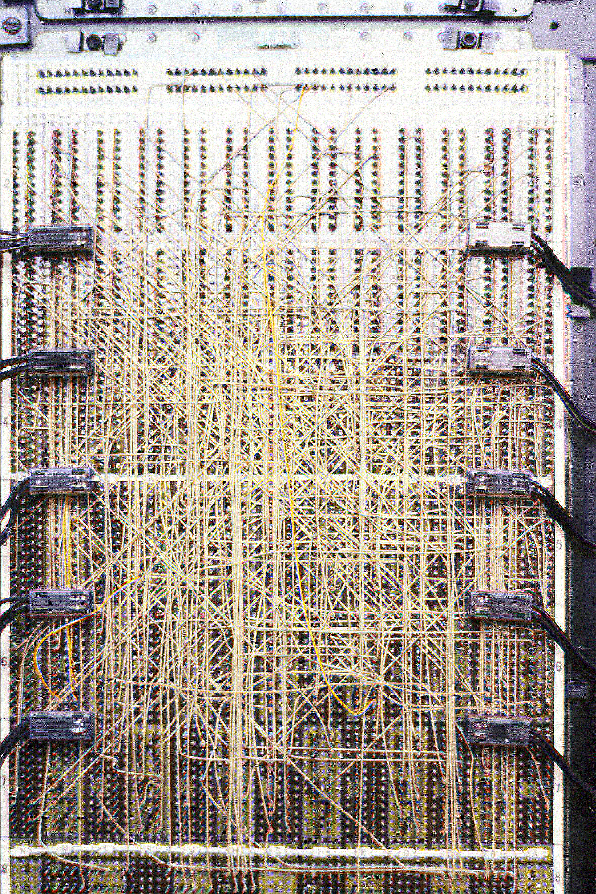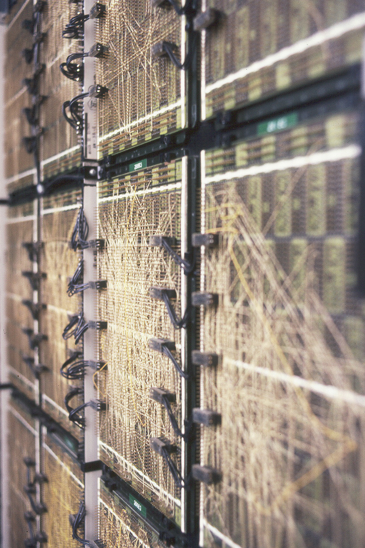Rechts ein Blick in einen SLT Frame mit vier Reihen nebeneinander und etlichen übereinander angeordneten Boards. Der senkrechte weiße Streifen ist die zentrale Stromversorgung für das Frame, von dort erfolgt die Stromversorgung für die Boards.