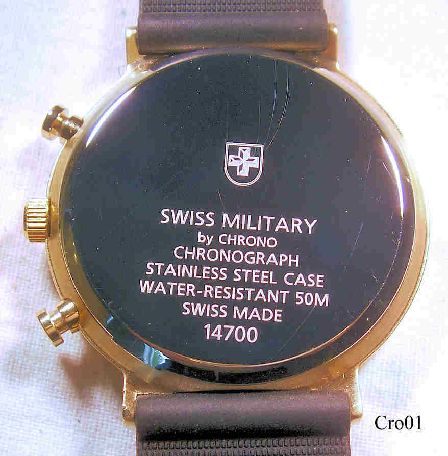 A Chronograph of the Collection of the company Chrono . Signed front: “Swiss, Military, by Chrono, Chronograph, 50 Meters”, back: ”Swiss Military, by Chrono, Chronograph, Stainless Steel Case, Water resistant 50M, Swiss Made, 14700 ”, inside: “ETA G10.21A movement, Date at “4”