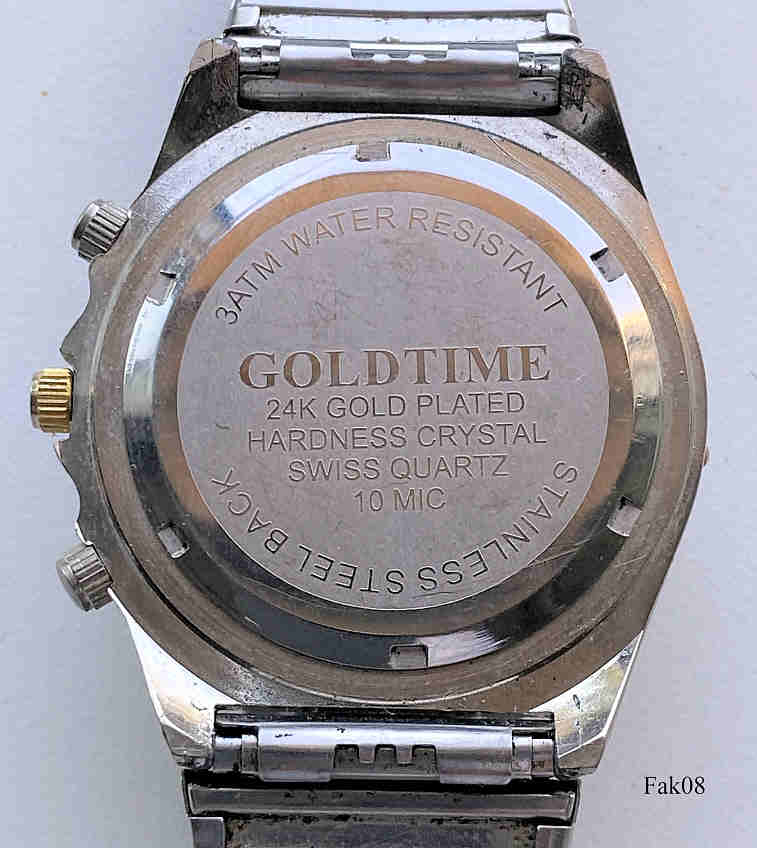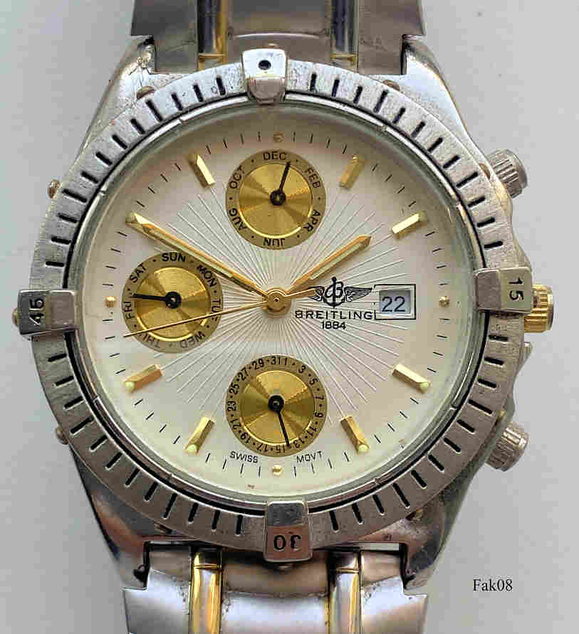 Dies ist eine nachgemachte Breitling, wie es sie im Original wohl nicht gibt. Die drei Chronos zeigen oben den Monat, Mitte den Wochentag und unten das Datum. Beschriftet vorn: “Breitling 1884, Swiss Movmt”, innen: “Unadjusted, Miyota Co, 2115, Japan, No Jewels”, hinten: “3 ATM Water Resistant, Goldtime, 24K Gold Plated, Hardness Crystal, Swiss Quartz, 10 MIC”. Die Rückwand gehört zu einer anderen Uhr. Sehr schönes Speidel Band