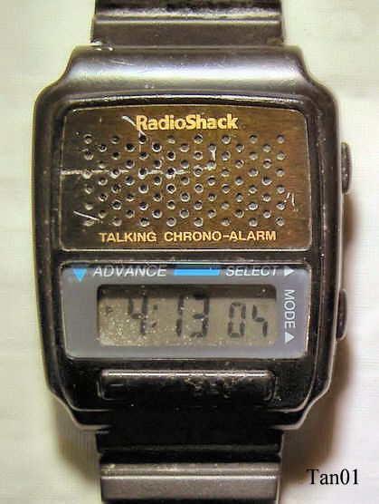 Eine sprechende Armbanduhr aus China, vertrieben über Radio Shack in USA. Beim Drücken auf den unteren “Talking” Knopf sagt die Uhr in englisch die Zeit an. Beschriftet vorn: ”Radio Shack, Talking Chrono Alarm”, hinten: ”Radio Shack TM, Cat. No. 63-5046, Custom MFD in China for Tandy / InterTAN”