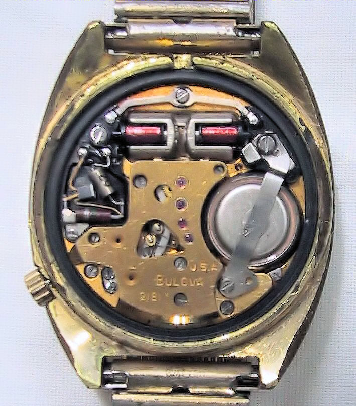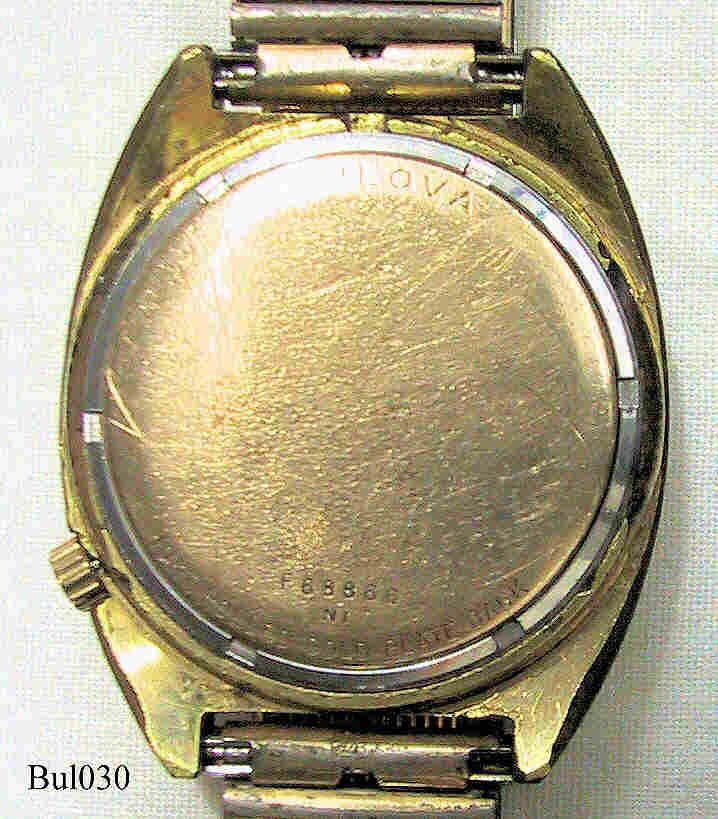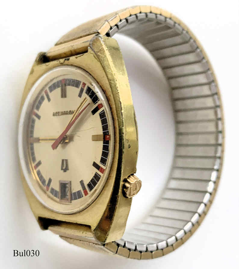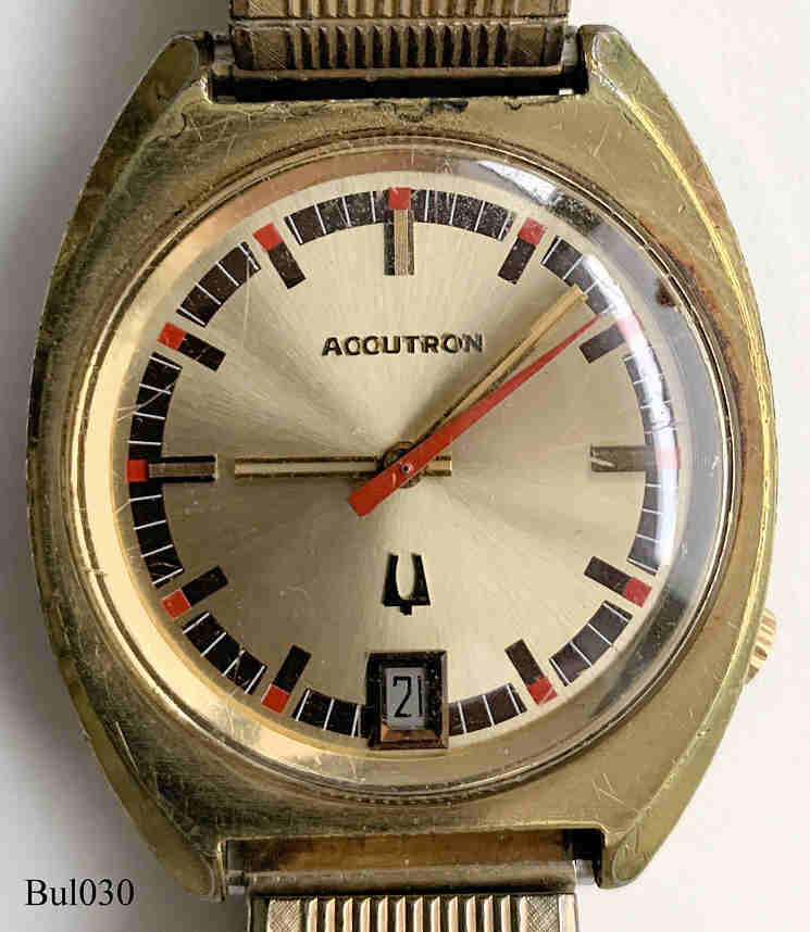 Bulova Accutron with gold plated case, signed front: “Accutron”, back: ”Bulova, 10K rolled gold plate back, F68866, N1”, inside: “USA, BULOVA, 2181”, Case # 3122, Caliber 2181, manufacturing date 1971 (N1), screw-on back, date in silver at 6, crown at 4, Speidel metal band. The case is heavily worn and the gold plating has worn off at several places.