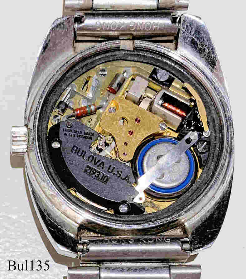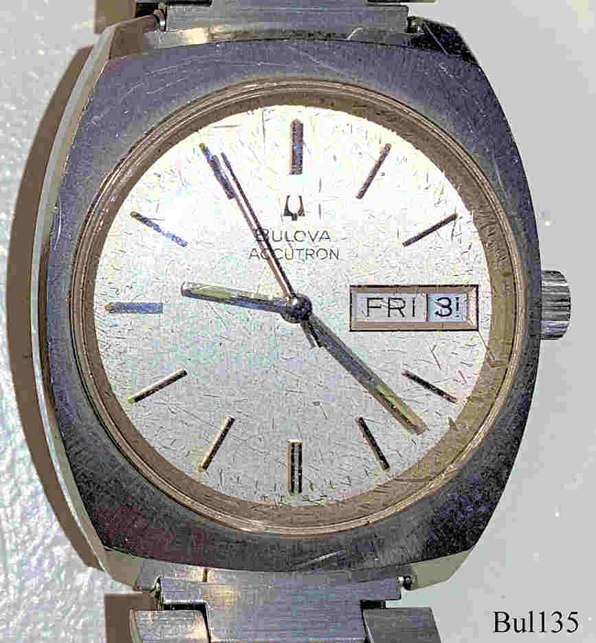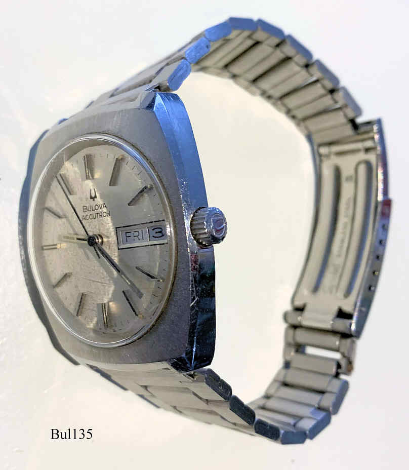 Bulova Accutron with Stainless Steel case, signed front: “Bulova, Accutron, S.T.”, back: “J751904, Bulova, Patented, Water resistant, Stainless Steel”, inside: “Bulova, U.S.A., 2193.10, Push only when in Set position”, Caliber 2193.10, date of production 1973 (N3), Case # 7306-3, screw-on back, Day Date in white at 3.