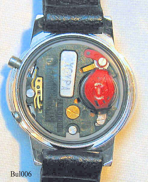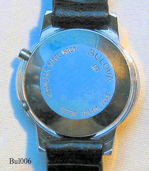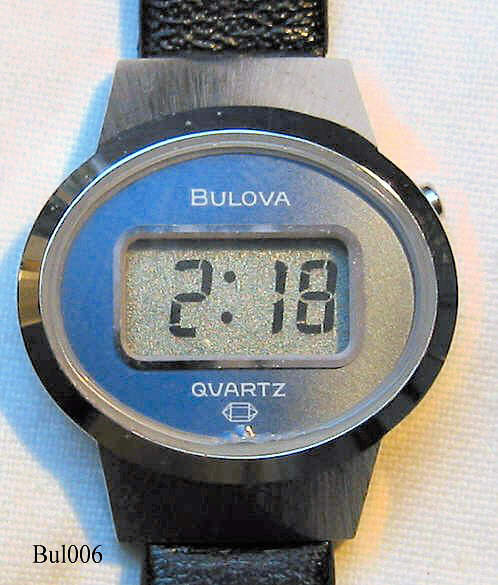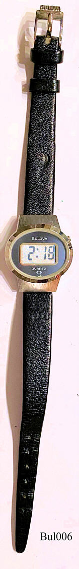 Dies ist eine Bulova Damen LCD Digitaluhr. Base Metal Gehäuse, Edelstahl Rückseite. Beschriftet:” Bulova, Quartz”, hinten: ”Bulova, N7, Base Metal Bezel, Stainless Steel Back”, innen: “Bulova, Unadjusted, Japan, No-0-Jewels, 3011.10, N7”, Herstelldatun 1977 (N7).