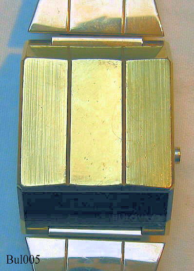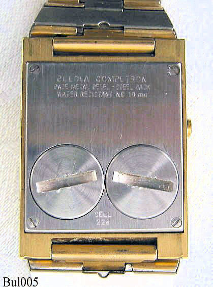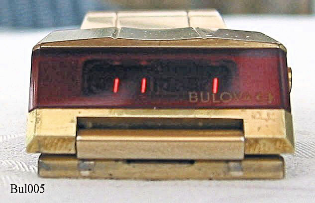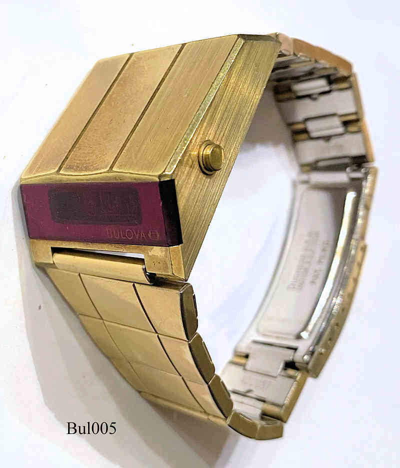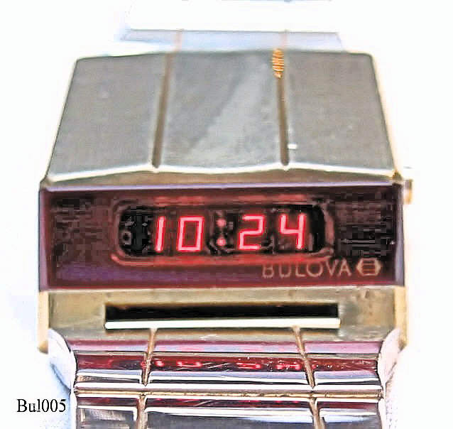 Dies ist eine Bulova Computron LED Uhr, Beschriftet: ”Bulova Computron, Base Metal Bezel - Steel Back, Water Resistant, N6, 10mµ, Cell 228”. Herstellung 1976 (N6). Diese Uhr hat ein besonderes Design und wird deshalb auch “Bulova Autofahrer Uhr (Drivers Watch)” genannt, da man die Uhrzeit ablesen kann, ohne die Hand vom Lenkrad zu nehmen. Allerdings benötigt man die andere Hand, um den Anzeigekneopf zu drücken. Einmal drücken zeigt die Uhrzeit, zweimal drücken zeigt das Datum (hier der 1. November)