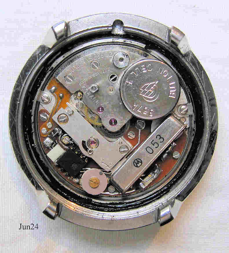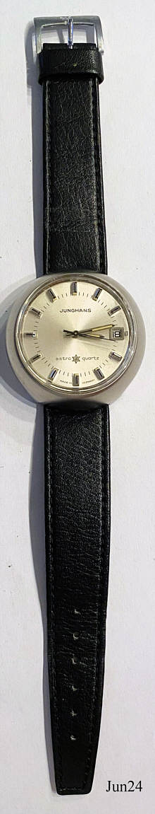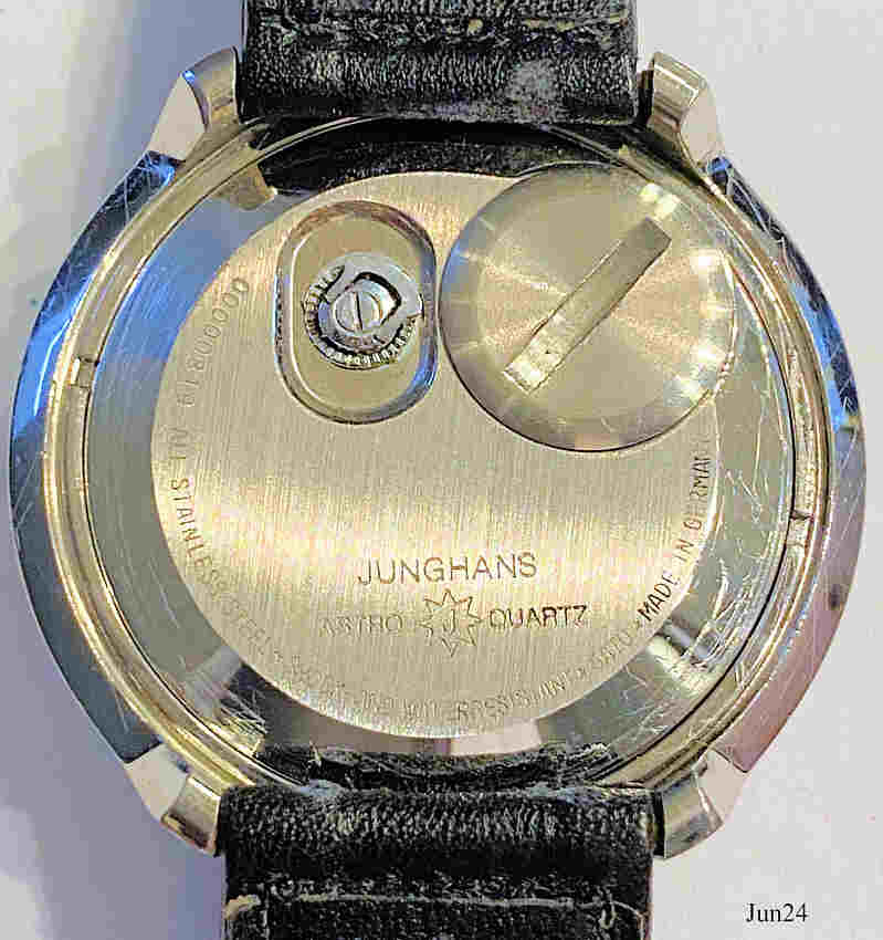 Eine Junghans Astro Quartz, die erste deutsche Analog Quartz Uhr. Kaliber 666.02 von 1974 aus der ersten Serie, mit einem Quartz von Motorola. Inschrift vorn: ”JUNGHANS, Astro Quartz, Made in Germany”, hinten: ”Junghans, Astro Quartz, 00000819, All Stainless Steel, Shock and Water Resistant, 5 ATU, Made in Germany”, innen: “Junghans, 666.02, Made in Germany, 007862”. Rückseitig ein geschraubtes Batteriefach und die Stellkrone.
