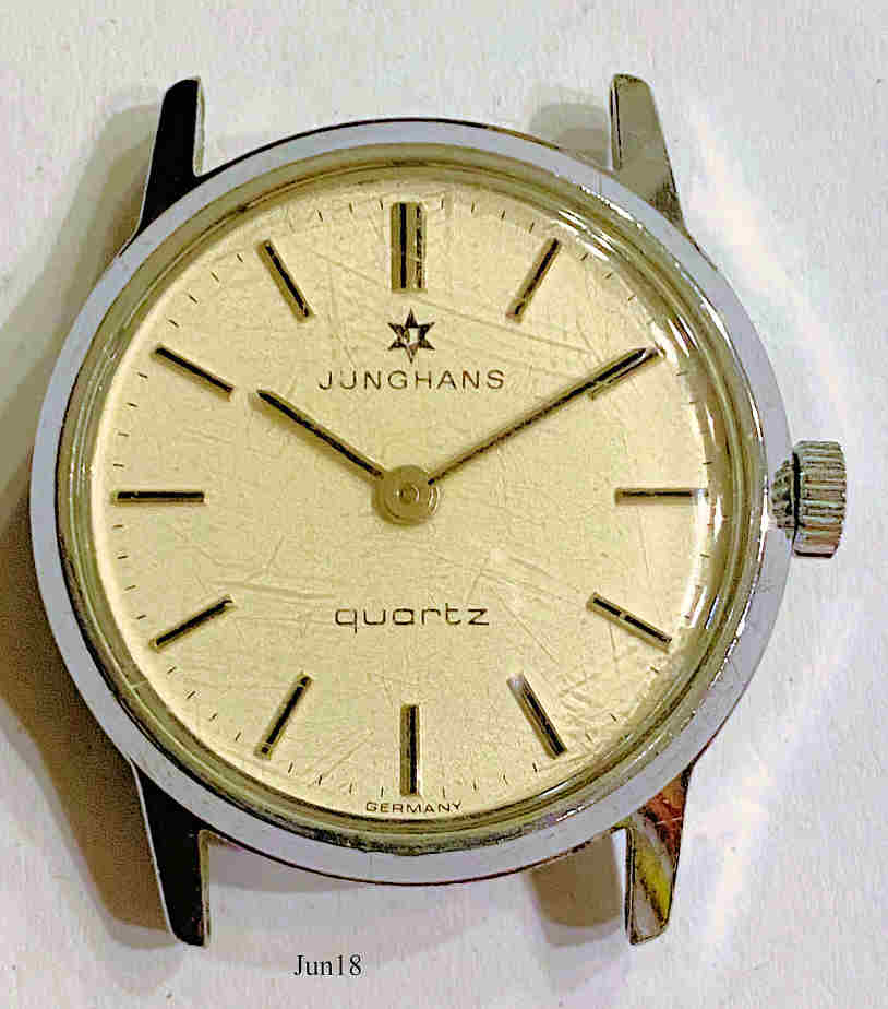 Eine Junghans Quartz Damenuhr im Edelstahl Gehäuse. Hier das Kaliber 40. Inschrift vorn: ”JUNGHANS, Quartz, Germany”, hinten: ”Junghans, Made in Germany, Base Metal Bezel, Stainless Steel Back, Shock and Water Resistant / DIN, 15 / 0111”, innen: ”EJ 40, West Germany, (5) Five Jewels, Unadjusted”.