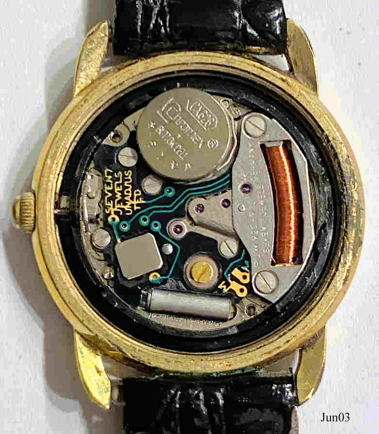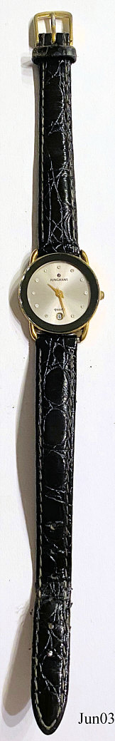 A Junghans ladies dresswatch with silver sunburst dial and attached zirkonia as numbers. Gold plated case and Stainless Steel Back. Signed front: ”Junghans, Quartz”, back: “Base Metal Bezel, Stainless Steel Back, Quartz, 47/7840”, inside: ”seven Jewels, Unadjusted, PUW 920-932, Germany, Seven 7 Jewels”, Movement PUW 920-932, see also the corresponding men’s watch.