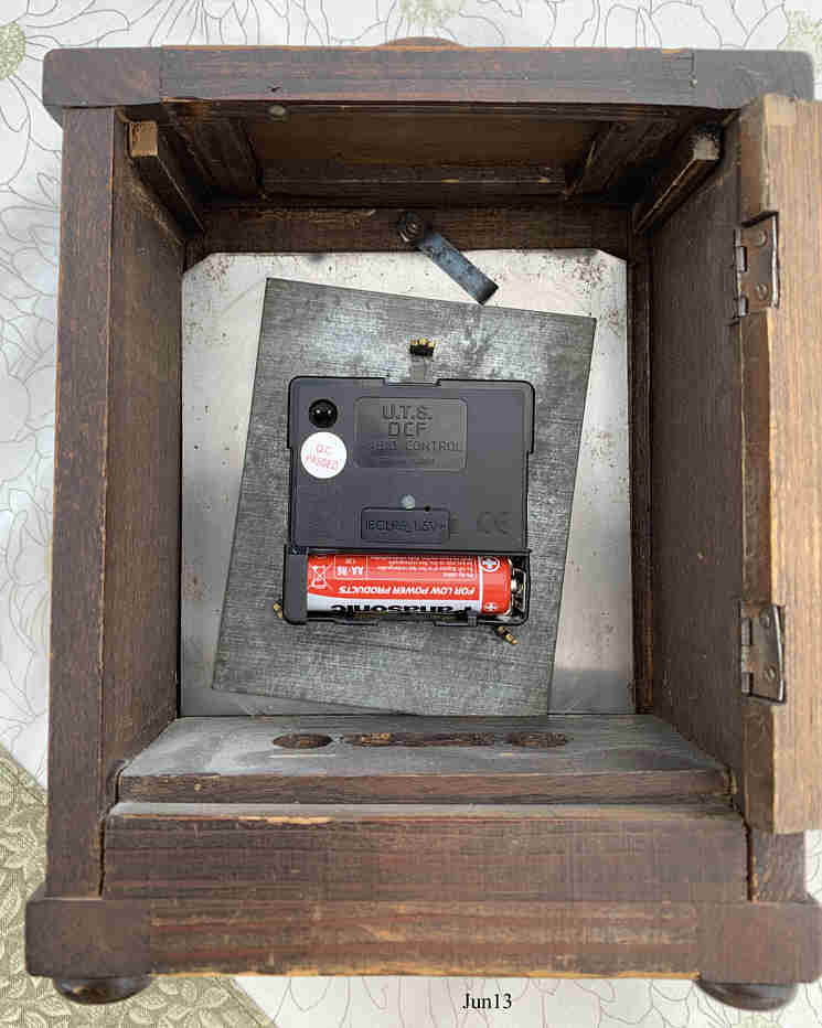 A very nice Junghans alarm clock in wooden cabinet. Blue hands, silverdial with stylish numbers. I installed a radio controlled movement, the Original movement is still available.