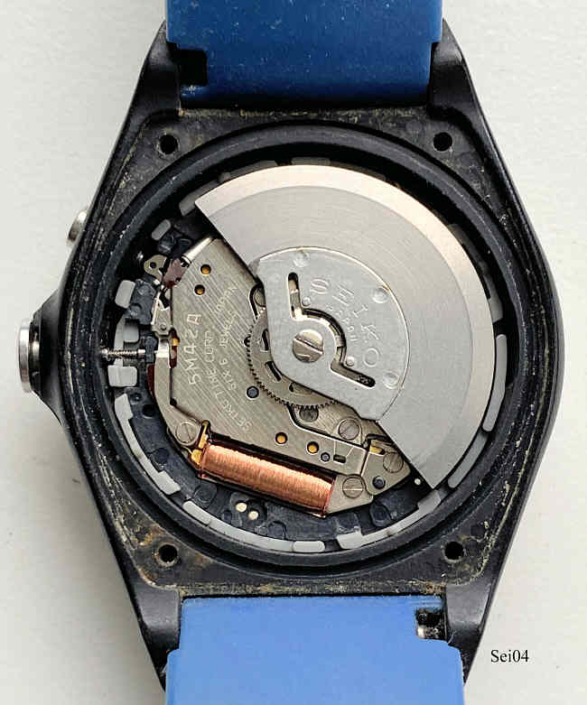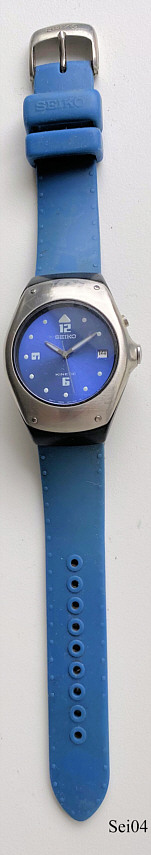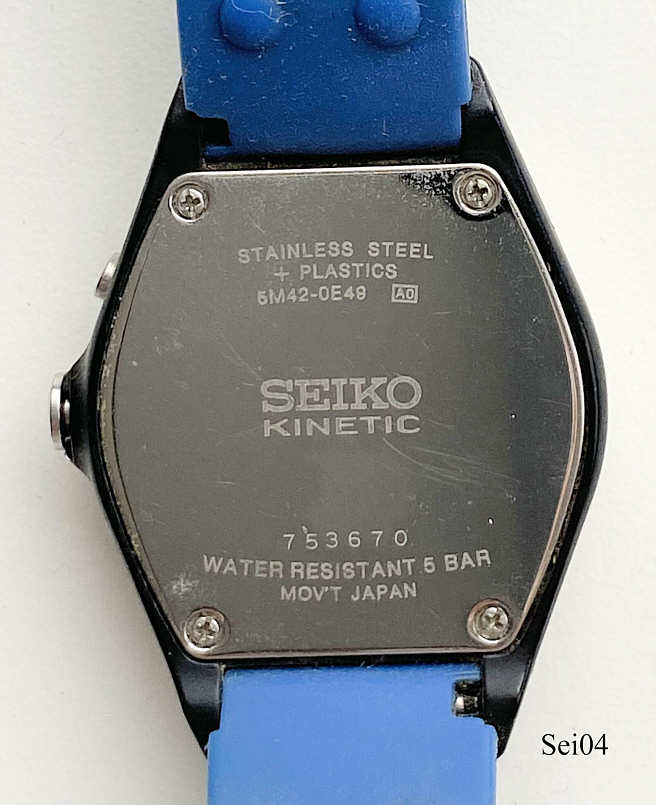A Seiko Kinetic watch with plastic case. A Generator generates, driven through an automatic weight, the energy to load a condensator. This condensator then drives the quartz movement. Signed front: ”Seiko, Kinetic, 6”, back: ”Stainless Steel + plastics, 5M42-OE49 A0, Seiko Kinetic, 753670, Water Resistant 5 Bar, Mov’t Japan”, inside: “5M42A, Seiko Time Corp. Japan, Six 6 Jewels, Seiko, Japan”. Blue plastic band.