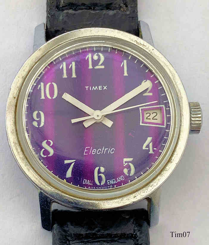 Dies ist eine Damen Timex electric, eine der frühen elektrischen Armbanduhren, bei denen die Batterie nur die Aufzugsfeder ersetzt. Die Unruhe wird über eine elektrisch angesteuerte Spule in ein Magnetfeld gezogen, über Kontakte wird der Stromkreis unterbrochen, die Unruhe schwingt zurück, der Stromkreis wird wieder geschlossen......Die Uhr hat ein sehr einfaches Gehäuse, wie bei Timex üblich. Bezeichnet vorn: “Timex, Electric, Dial England”, hinten: “Timex C Cell, Taiwan, Water Resistant, Base Metal Bezel, Stainless Steelback”, innen: “Timex, Taiwan,Four 4 Jewels, Unadjusted, 385”. Schwarzes Lederband.