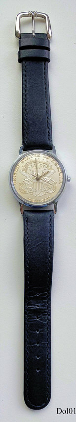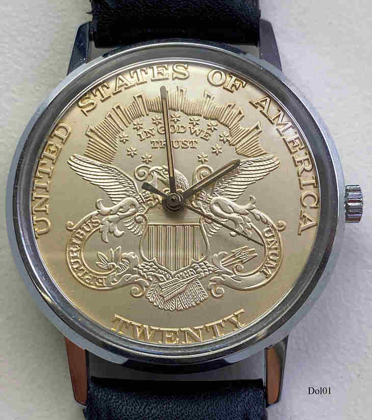 Dies ist eine einfache Quartzuhr mit 20 Dollar Zifferblatt. Beschriftet vorn: ”United States of Amerika, Twenty, In God We Trust”, innen: ” ”, hinten: “145109, Stainless Steel Back”, Schwarzes Lederarmband. Keine Hersteller oder Werksangaben.