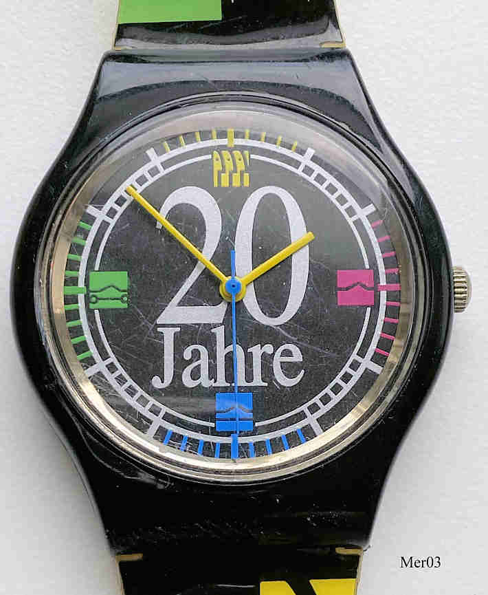 Eine Quartzuhr im Swatch Design zur Erinnerung an 20 Jahre Mercedes Werk Bremen 1998. Beschriftet vorn: “20 Jahre”, hinten: ”Stainless Steel back, max, Water Resistant, 3 ATM”, innen: “ No 0 Jewels,Swiss Parts, Thailand Movement, ETA 802.104”. Das Werk ist ein ETA Kaliber 802.104.Auf dem Armband: “Made in Bremen, Mercedes PKW”