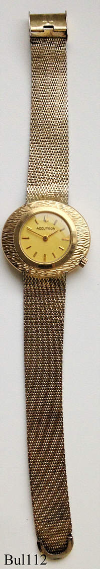 Eine Bulova Accutron mit ovalem 10 K vergoldetem Gehäuse ohne Zentralsekunde, goldenes Zifferblatt, Beschriftet vorn: ”Accutron”, hinten: “BULOVA, H594931, N0”, innen: “U.S.A. Bulova, 2183”. Case # B3022, Kaliber 2183, Herstelldatum 1970 (N0), Krone bei 4, integriertes 10K vergoldetes Champion Gliederarmband.