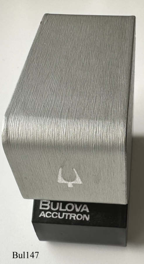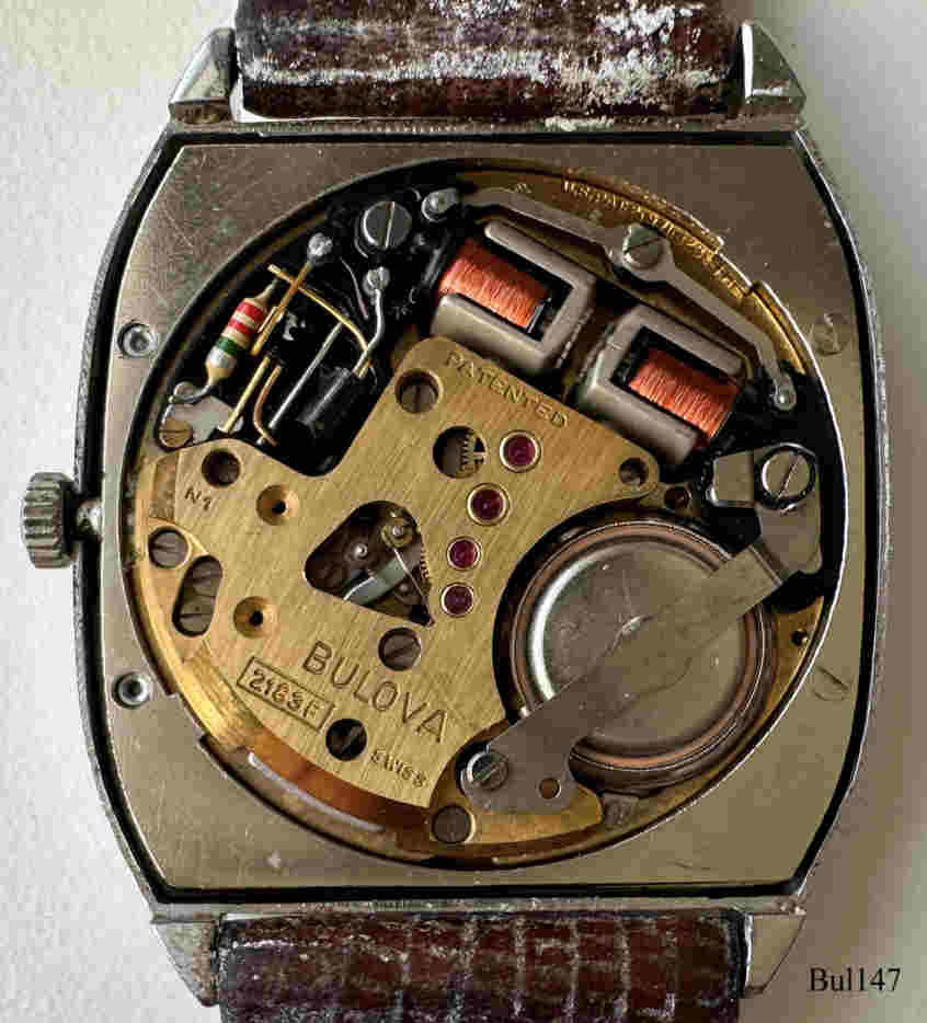 Eine Bulova Accutron mit ovalem 10 K vergoldetem Gehäuse ohne Zentralsekunde, goldenes Zifferblatt, Beschriftet vorn: ”Accutron”, hinten: “BULOVA, H594931, N0”, innen: “U.S.A. Bulova, 2183”. Case # B3022,  Kaliber 2183, Herstelldatum 1970 (N0), Krone bei 4, integriertes 10K vergoldetes Champion Gliederarmband.