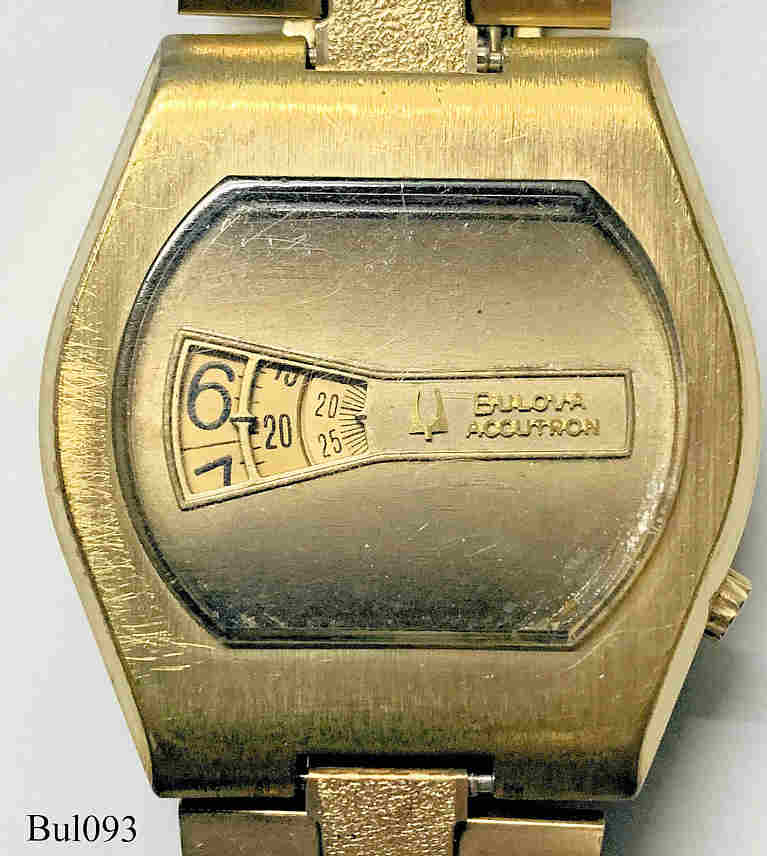 Eine Bulova Accutron Direct Read mit vergoldetem Gehäuse mit Sekunde, goldton Ziffernscheiben, Beschriftet vorn: “BULOVA, Accutron”, hinten: “Bulova, Stainless Steel Back, Water Resistant, Gold Electroplated Bezel, N3, F490534”, innen: “USA, Bulova, 2186”. Case #3316 , Caliber 2186, Herstelldatum 1973 (N3), Nr. F 490534, goldfarbenes Metallarmband. Dieses Kaliber ist wohl das seltenste der 218 Serie .