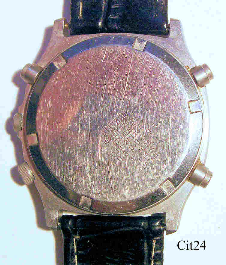 Ein Citizen Chronograph mit Edelstahl Gehäuse und Stainless Steel Back. Kaliber Citizen 3510 (Miyota 3S10), Datum bei der 6, Beschriftung vorn: “Citizen, Quartz, Chronograph, Alarm, Water Resist, 100“, hinten: “Citizen, Water Resist, Stainless, 3510-351240 K, 50600395, 37-30367, GN-4-S, Japan”, innen: “Unadjusted, 3510, Twelve 12 Jewels, Citizen Watch Co.”. Schwarzes Lederarmband.