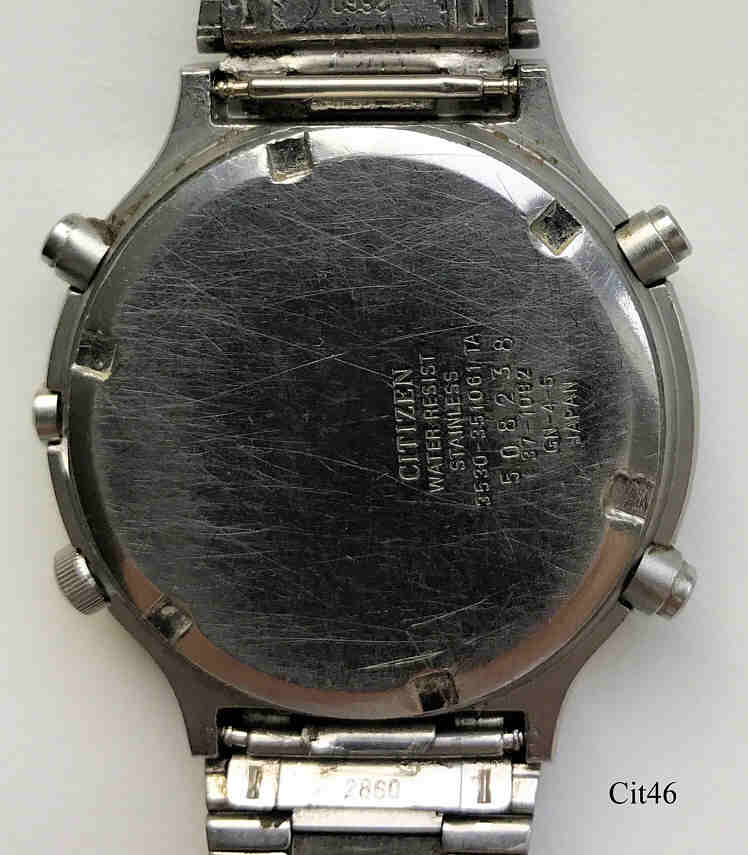 Ein Citizen Chronograph mit Edelstahl Gehäuse und Stainless Steel Back. Kaliber Citizen 3530 (Miyota 3S30), Beschriftung vorn: “Citizen, Quartz, Chronograph, Alarm, Water Resist, 100“, hinten: “Citizen, Water Resist, Stainless, 3530-351081TA, 508238, 37-1092, GN-4-S, Japan”, innen: “Citizen Watch Co., unadjusted, 3S31A, twelve12Jewels, Japan”. Edelstahl Gliederarmband.