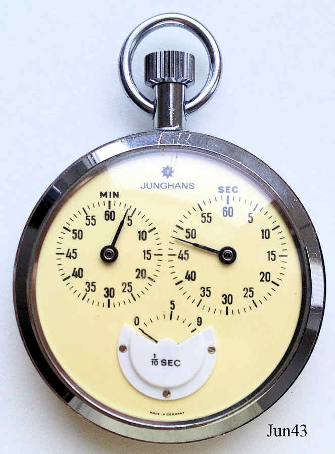 Eine Junghans Stoppuhr mit verchromtem Base Metal Gehäuse. Zeiger und Ziffern in schwarz, Zifferblatt cremefarben. Drei Skalen: Unten Mitte 1/10 Sec, oben rechts Sekunden, oben links Minuten. Beschriftet außen: “Junghans, Made in Germany”, Innen: ”Gebr. Junghans, seven (7) Jewels, Unadjusted, Made in Germany, 628, D74”, hinten: ”HLV, Bezirk Darmstadt, Nr. 05” Kaliber Junghans 628. Diese Stopuhr stammt aus dem Nachlass von Georg Born, Ehemaliger HLV Bezirksvorsitzender Bezirk Darmstadt, Träger des Bundesverdienstkreuzes