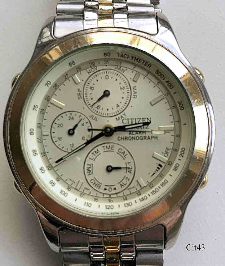 A Citizen Chronograph with sTitanium case and back. Caliber Citizen 6870A, Date at 3, signed front: “Citizen, Titanium, Chronograph, WR100“, back: “ Citizen Watch Co, Water.Resist Base Metal MPDG, 6850-G82097 K, 571273, GN-4-S, Japan->9”, inside: “Citizen Watch Co, No Jewels, 6870A, Japan”. Two colors Stainless band.