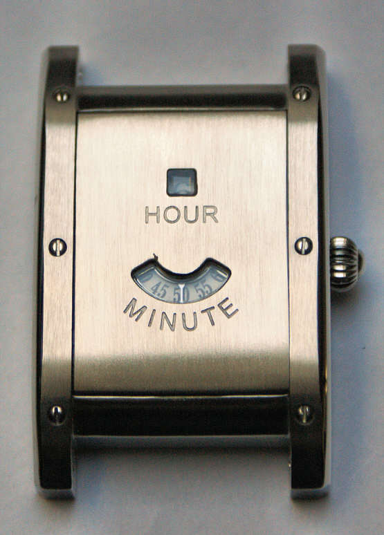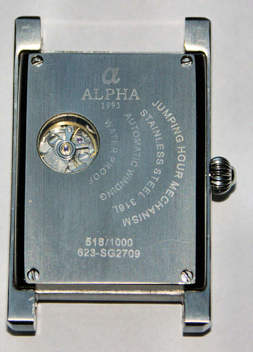 A mechanical digital watch by Alpha in Retro Style. Signed front: ”Hour, Minute”, back: ”Alpha, 1993, Jumping Hour Mechanism, Stainless Steel 316L, Automatic Winding, Water Proof, 518/1000, 623-SG2709”, Metal case.