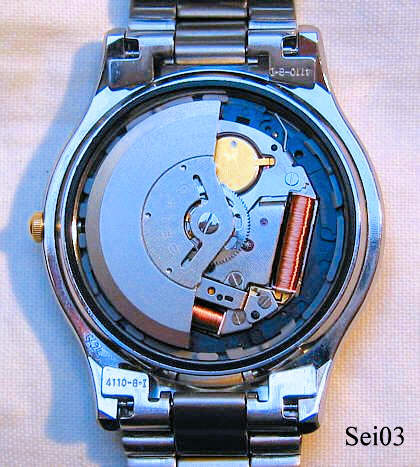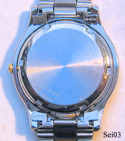 Dies ist eine twotone Seiko Herrenuhr mit Automatic Generating System, die erste Version der Uhren mit mechanisch angetriebenem Generator, der den Strom für den Kondensator erzeugt. Später war das Logo dann “Kinetik”. Datum bei der 3. Beschriftung: ”SEIKO, Automatic Generating System, Japan 5M22-8A30 T 2“, hinten: ”SEIKO, Water Resistant, Japan MM, 5M22-8A80 A4, St. Steel, Base Metal Bezel,362648” mit Stahlboden und zweifarbigem Metallarmband.