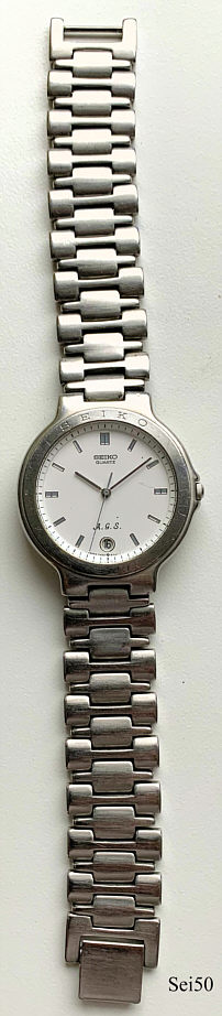 Dies ist eine Edelstahl Seiko Herrenuhr mit Automatic Generating System, die erste Version der Uhren mit mechanisch angetriebenem Generator, der den Strom für den Kondensator erzeugt. Später war das Logo dann “Kinetik”. Datum bei der 6. Beschriftung: ”SEIKO, A.G.S., Japan 7M22-6A30 T 2“, hinten: ”SEIKO, Water Resist. AD, Stainless Steel, Japan, 7M22-6A30 R1, 7N2583” mit Glasboden und Metallarmband.