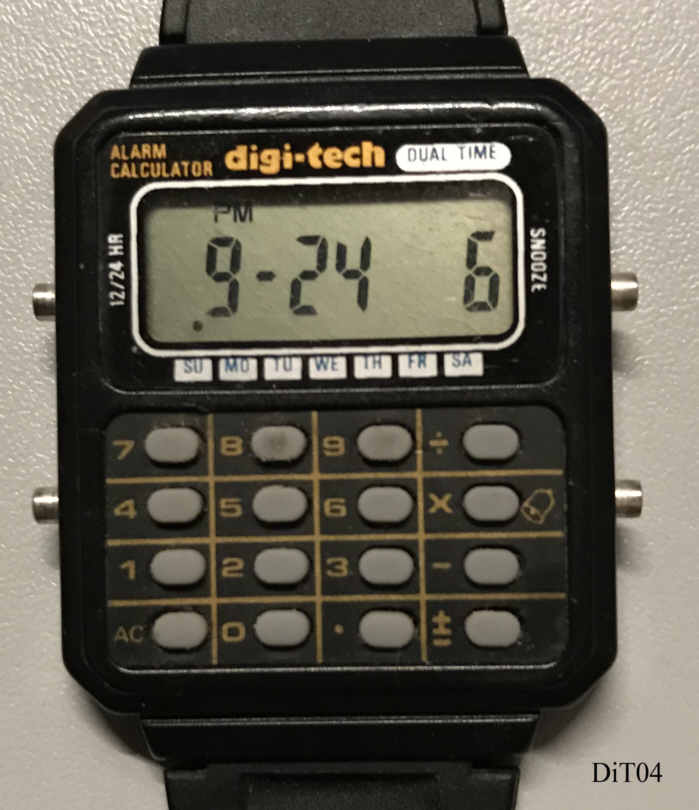 .A DigiTech Alarm Calculator watch with two time zones in plastic case. Signed front: “Digi-Tech, Alarm Calculator, Dual Time”, Inside: ”RC17”, back: ” ”, Caliber RC17. Plastic band
