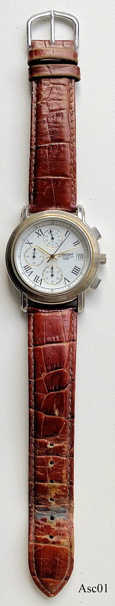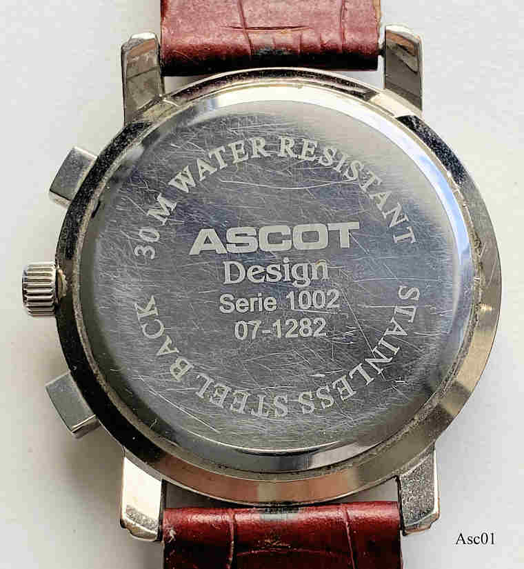 Ein Chronograph von Ascot mit römischen Ziffern auf dem Zifferblatt, Datum bei der 3. Beschriftet vorn: “Ascot, Chronograph, 30M”, hinten: ”Ascot, Design, Serie 1002, 07-1282, Stainless Steel Back, 30M Water Resistsant”, innen: “SIIO, No Jewels, Japan, VD57B” . Braunes Lederarmband, Kaliber SIIO VD57B