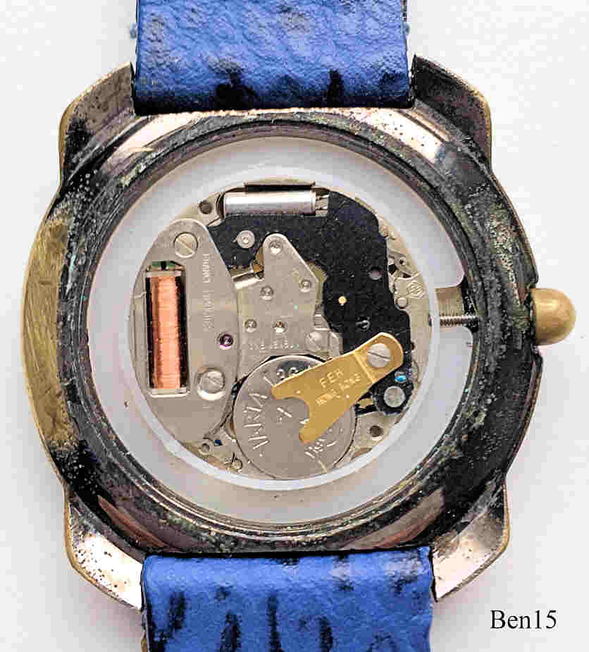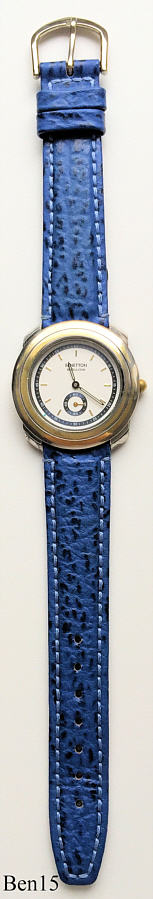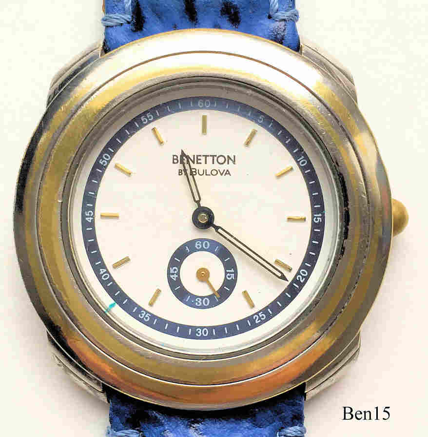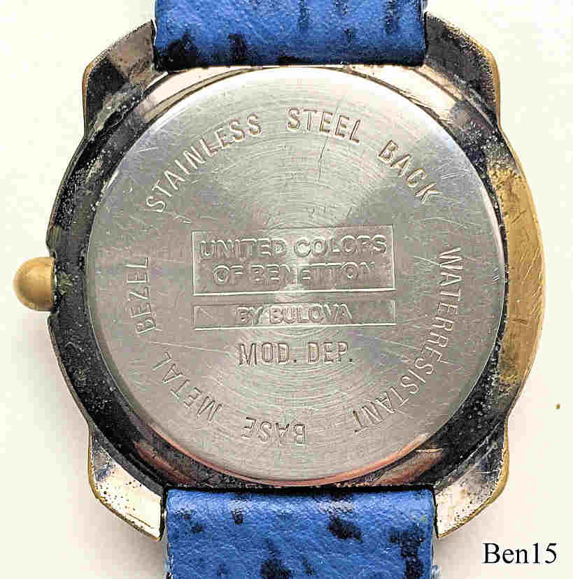 Eine Benetton by Bulova Retro Model, Beschriftet vorn: ”Benetton by Bulova”, hinten: ”United Colors of Benetton by Bulova, Stainless Steel Back, Water Resistant, Base Metal Bezel, Mod. Dep.”, Blaues Lederarmband mit neutraler Schließe. Kaliber France Ebauches FE 911.