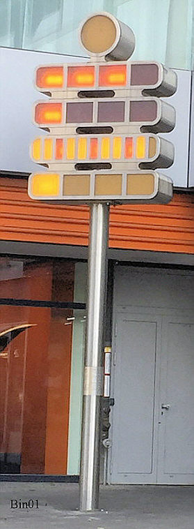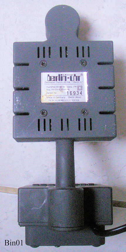 Dies ist das Modell der “Berlin Uhr”, die von D. Binninger im Auftrag des Berliner Senats entwickelt und am KuDamm aufgestellt wurde. Heute steht sie hinter dem Europa Center. Diese Uhr wird auch Mengenlehre Uhr genannt, da die Zeit durch addieren der verschiedenen Lichtbalken abgelesen wird. Die obere Reihe zeigt die 5-Stunden Intervalle an, die zweite Reihe die Stunden, die dritte Reihe zeigt die 5-Minuten wobei jede dritte LED in rot abgesetzt ist, damit man die 15 Minuten Intervalle besser erkennen kann, die untere Reihe zeigt dann die Minuten. Die runde LED an der Spitze blinkt im 2 Sekundenrhytmus. Somit ist die Zeit auf der linken Abbildung: 3x 5 Stunden plus 1x 1 Stunde gleich 16 Uhr und 10x 5 Minuten + 0x 1 Minute gleich 16 Uhr 50 Minuten. Auf dem mittleren Bild nach gleicher Logik: 3x 5 Stunden + 4x 1 Stunde + 5x 5 Minuten +0x 1 Minute gleich 19 Uhr und 25 Minuten. Ganz einfach, richtig? Das Modell trägt die Seriennummer 16934 und wurde in Berlin in den Souveniershops für 100,- DM verkauft.