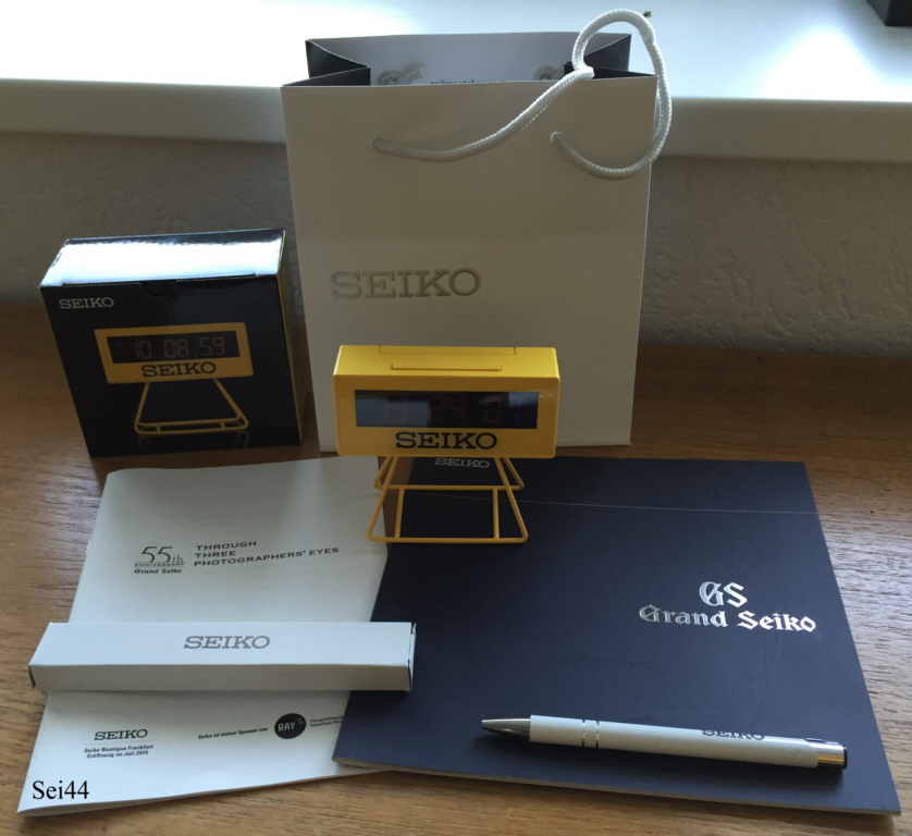 Ein digitaler Reisewecker von Seiko in gelbem Plastik Gehäuse. Diese Uhr war Bestandteil des VIP Geschenk Sets zur Eröffnung der Seiko Boutique in Frankfurt im Juli 2015. Dazu gehörte ein Grand Seiko Prospekt, ein Kugelschreiber, ein radierbarer Kugelschreiber und ein Photoprospekt, siehe Abbildung. Beschriftet vorn: “Seiko”, hinten: “Seiko Boutique, Eröffnung Juli 2015”.