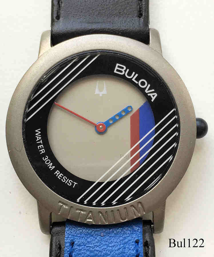 Eine recht moderne Damen Designuhr von Bulova , beschriftet vorn: “BULOVA, Water 30M Resist, Titanium”, hinten: ”30M Waterresistant, All Titanium Case, 3978906, 766988”, innen: “BULOVA, 561.001”, kein Herstelldatum, Lederarmband im Zifferblatt Design. Werk Kaliber ETA 561.001