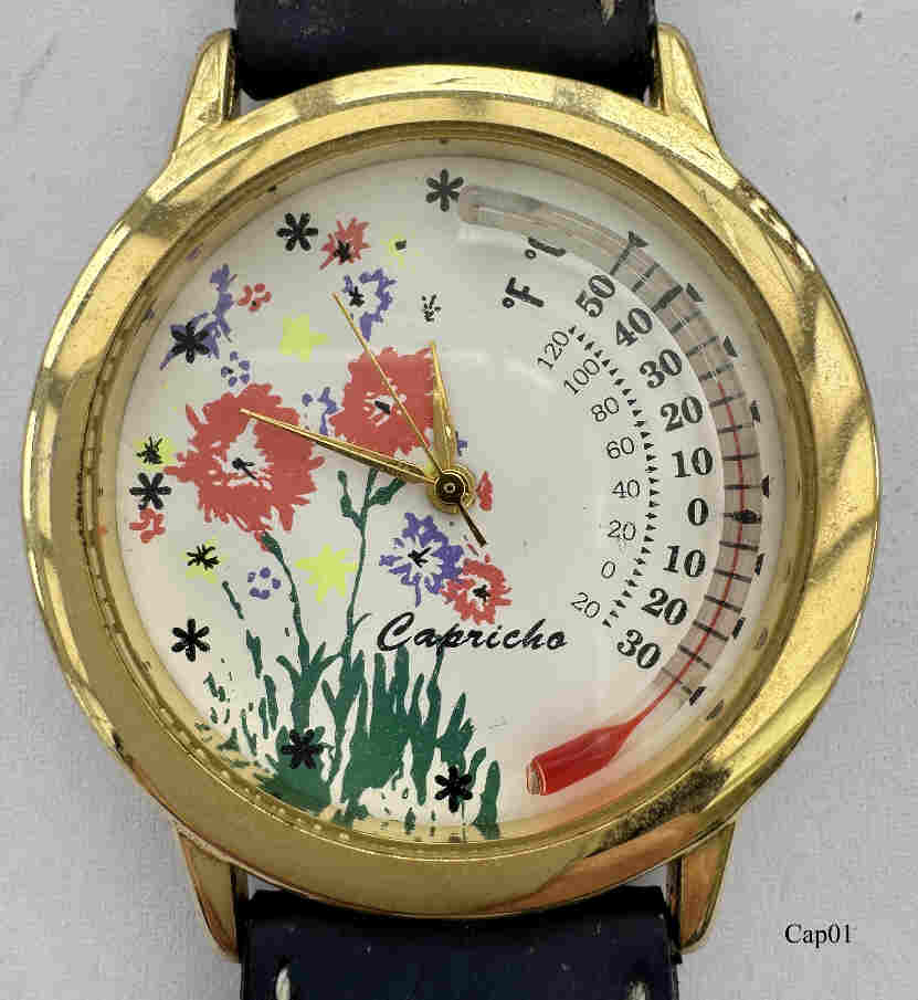 A unique interesting quartz watch with alcohol filled glas thermometer in the dial. Signed front: ”Capricho, thermometer scale in Fahrenheit and celsius”, back: ” “, inside: ”Unadjusted, Miyota Co., Japan, No Jewels”, Flower decor in the dial, very nice country type leather band, gold plated case.