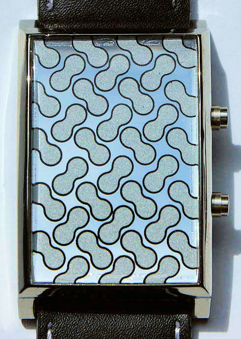 This is an extremely uncommon LED watch from China, I call it Chaos LED. Unlit it looks like a modern piece of art, lit it shows the exact time in a very uncommon way: The red LEDs show the hours, the yellow LEDs show 5 minutes, the green LEDs show the minutes. In the first example it reads: 4x red = 4:00, 2x yellow = 10 minutes, 1x green is 1 minute, so the time is 4:11, the second example shows 12 times red =12 Hours, 4 times yellow = 20 Minutes and 3 times green = 3 Minutes so it shows 12:23 Hours.. Signature on the back: “Intercrew, c3788, Stainless Steel Back, Water Resistant, 3ATM”.