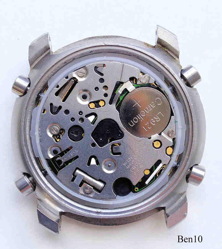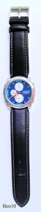 Ein Benetton by Bulova Chronograph, Beschriftet vorn: ”United Colors of Benetton, by Bulova”, hinten: ”United Colors of Benetton, by Bulova. Mod. Dep. 203, All Stainless Steel, United Chronos of Chronos, Water Resistant 5 ATM”, innen: “Miyota Co., No Jewels, 6W60, Japan”. Schwarzes Lederarmband mit neutraler Schließe.