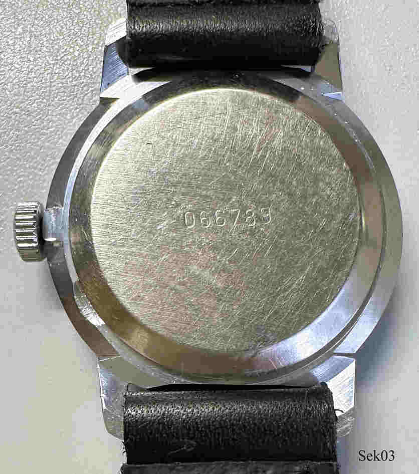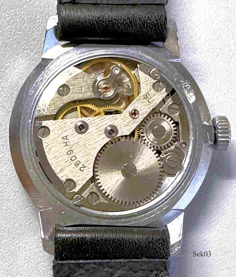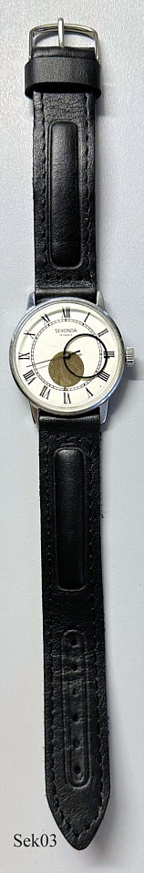 Eine Handaufzugsuhr der Firma Sekonda mit weißem Zifferblatt und schwarzem Lederband. Beschriftet vorn: “Sekonda, 19 Jewels, Made in USSR”, hinten: ”066789”, innen: ”2609 HA, SU”. Das Werk ist ein Handaufzugs Werk von Raketa, Kaliber 2609. Interessant sind die Zeiger, der Stundenzeiger symbolisiert die Sonne, der Minutenzeiger steht für die Planeten die sich um die Sonne drehen.. Gekauft in 2023 im Internet aus Kiew.