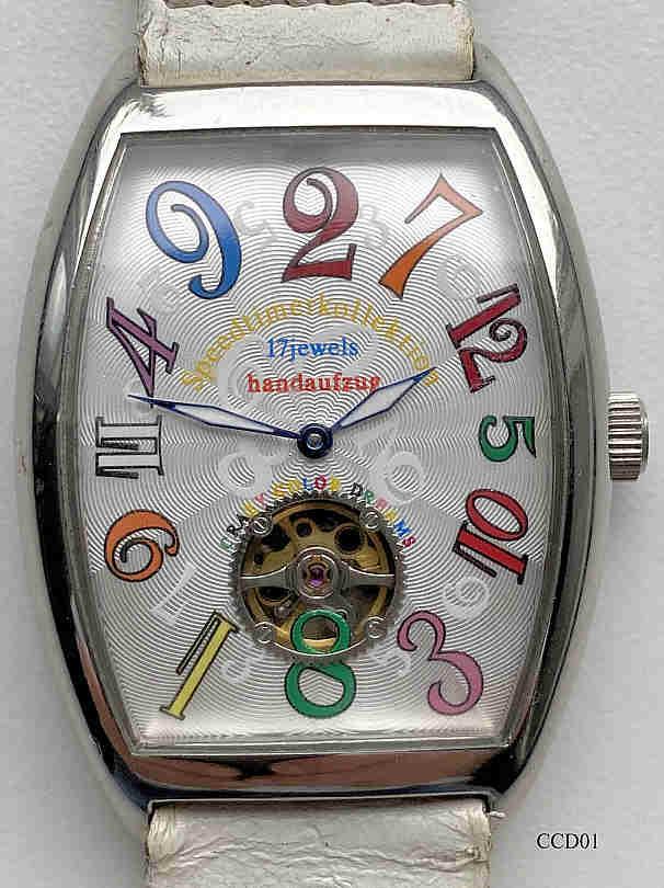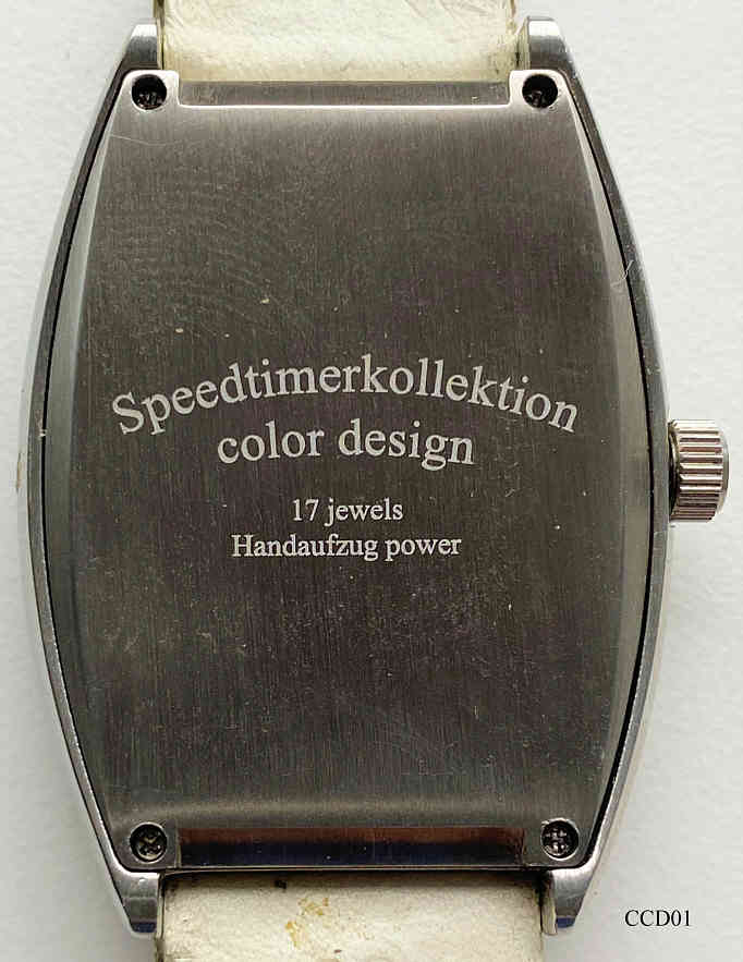 Eine sehr eigenwillige Handaufzugsuhr mit springendem Stundenzeiger, Edition Speedtimer Collection. Das Besondere an dieser Uhr ist der springende Stundenzeiger, der immer um 5 Stunden weiterspringt. Damit sind die Ziffern sehr chaotisch angeordnet, was natürlich den besonderen Reiz dieser Uhr ausmacht. Beschriftung vorn: “Speedtimer Collection, 17 Jewels, Handaufzug, Crazy Color Dreams”, innen: “ ”, hinten: “SpeedtimerKollektion, color design, 17 jewels, Handaufzug power”. Weißes bedrucktes Lederarmband