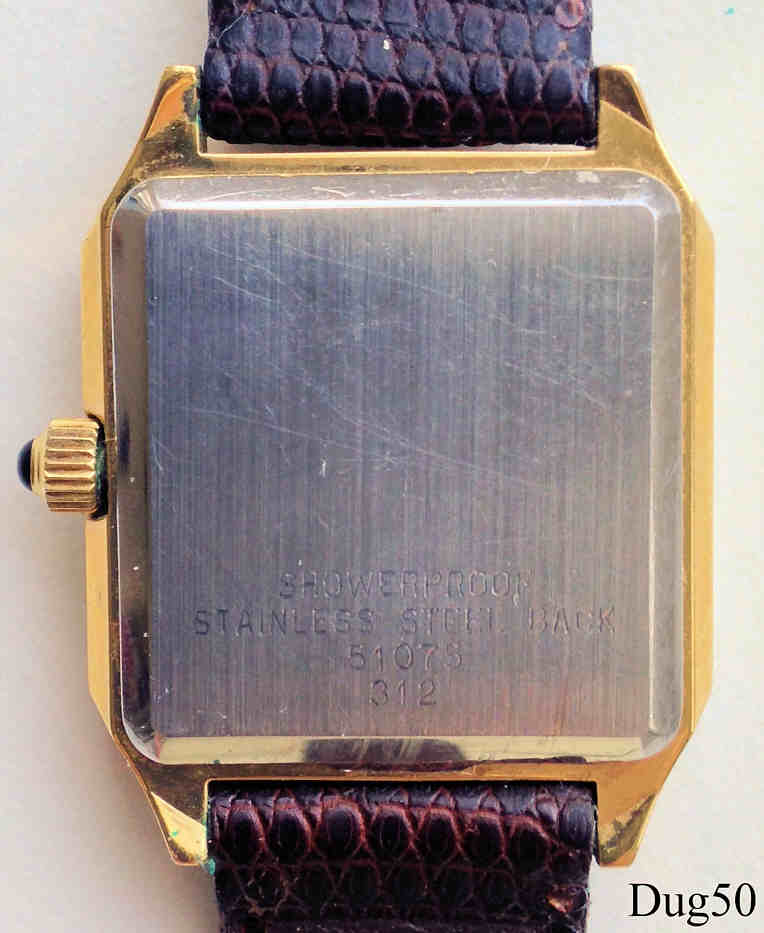 A Dugena ladies dresswatch with gold plated case and Stainless Steel Back. Caliber ETA 961.001. Signed front: “Dugena, Quartz” back: ”Showerproof, Stainless Steel Back, 51075, 512”, inside: ”Five 5 Jewels, Unadjusted, Swiss, ESA, 961.001”.