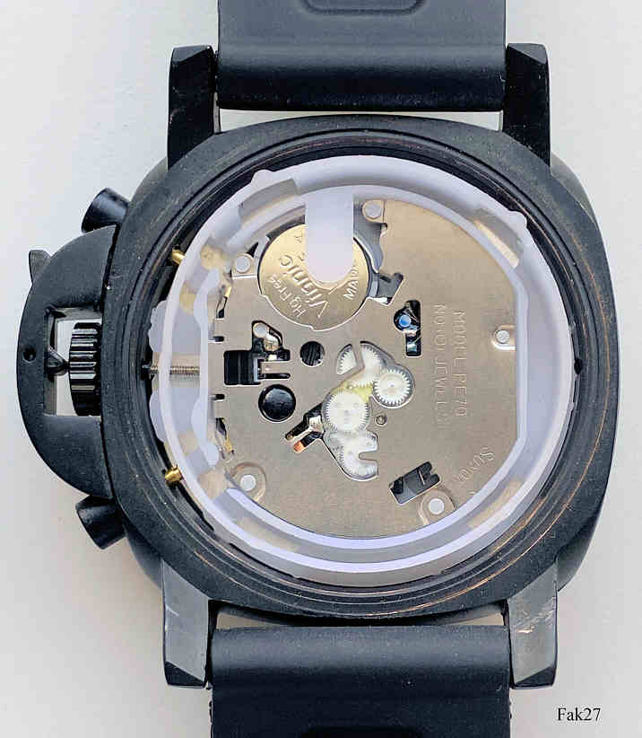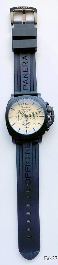This is the copy of a Panerai Luminor, whith working chronographs. Inside a Sunon PE70 movement. Signed front: “€Luminor, Panerai, Daylight, Swiss Made”, back: “Officine Panerai, Firenze, 1860, Automatic, Divers Professional, OP3293, BB0005168, Titanium, 300m, Amagnetic”, inside: “Sunon, Model PE70, No 0 Jewels”. Black rubber band.