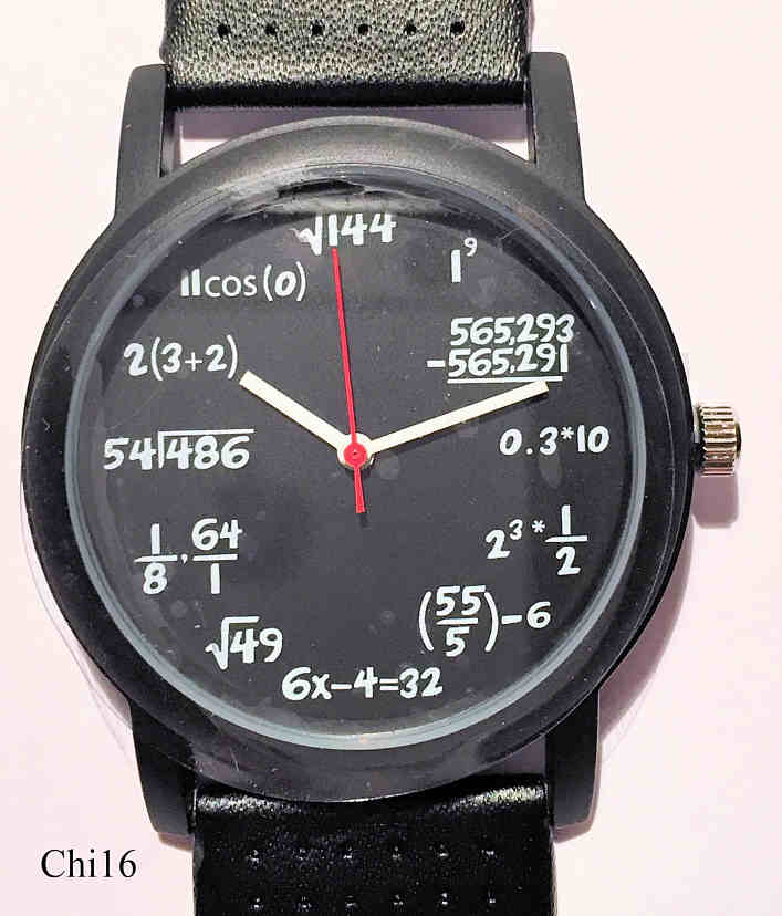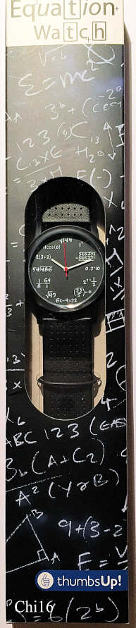 Eine einfache Quartzuhr mit einem witzigen Zifferblatt für Mathe Freaks, die Zahlen werden durch Mathematische Formeln dargestellt. Das schwarze Gehäuse ist aus Base Metal. Beschriftung vorn: ” “€, innen: “SIIO, P021”, hinten: ”CE, ThumbsUp!, EQUWAT, Movt Japan, Made in China”€. Uhrwerk Kaliber SIIO P021S1, Schwarzes Lederarmband.